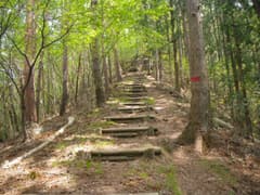 経塚山へは鳥居の前を右に進み、「経塚山登山道30分」の道標にしたがって、手摺のある山道に入る。地元の人の散歩道になっているようで、緩やかな尾根の上に良く踏まれた登山道が通じている。鮮やかな新緑に囲まれて、爽快な気分だ。