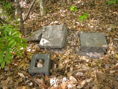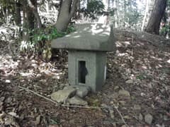 ホテル跡地から車道を下り、きのこ研究所の横を通る。この辺りは車道が錯綜しているので、歩いたことがあるKさんの案内で進む。車道から分かれて尾根上の踏み跡をゆるゆる登ると、荒神山(経の峰)の頂上に着く。祀られている石祠はU字溝とブロックを利用した近代的なものだが、傍らの立ち木には梵天が掲げられ、今でも信仰を集めているようだ。