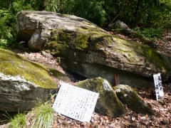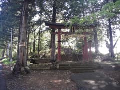 この先の左手の岩壁にぽっかりと開いた岩室がある。また、右手には岩場(天狗岩)があり、脇道が付いている。ます岩室を覗いてみる。中には祠が祀られ、楽に雨宿りできる広さがある。傍らの説明板に、高社山の信仰を要約した次のような文が記されている。