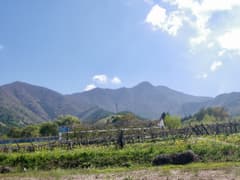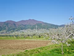 白い花が一面に咲くリンゴ畑を眺めながら高社山山麓を走り、赤岩コース登山口の高社神社に到着。神社裏手の空き地(かつてのゲートボール場?)に車を置く。神社左脇の狭い車道を隔てて登山者用WCがある。
