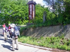 高社神社左の車道を上がると広域農道?の車道に出て、ここに「高社山登山道入口」という新しくて大きな案内看板が立つ。ツアー登山の団体が貸切バスで到着したところで、大勢のハイカーさんがたむろしている。今日は大賑わいの山になりそうだ。