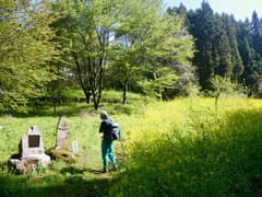墓地を抜けて山道に入ると満開の菜の花畑に出て、線刻の不動明王像が建つ。傍らに「高社山登山道十三仏復元事業」という新しい石碑もあり、これによると数年前に5つの石仏が復元されたそうだ。不動明王にも折れて修復した痕跡があり、このあと知ったところによると、廃仏毀釈により損傷を受けたらしい。