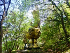 山道は小尾根の上を緩く登って行く。左側は谷厳(こくごん)寺の敷地で、緑深い樹林の中に金色の大仏数体がおわし、シュールな眺め。忠魂碑、電線が撤去された送電鉄塔を過ぎると線刻の釈迦如来がある。