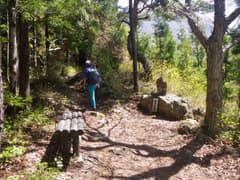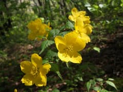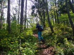 新緑に覆われた尾根をだらだらと登る。チゴユリやヤマブキの花が多い。電気牧柵を感電しないように注意して越え、文殊菩薩を過ぎる。