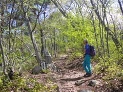 鮮やかな新緑に感嘆しながら尾根を登る。地蔵菩薩、薬師如来と、次々に線刻の石仏が現れて楽しい。観音菩薩の所にはベンチが設置され、樹林の切れ間から高社山の頂上稜線を望むことができる。