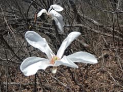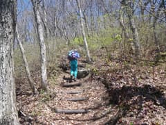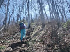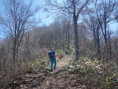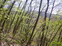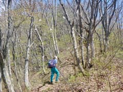 尾根上の道は次第に傾斜を増し、標高が上がるにしたがって緑が淡く薄くなる。見上げると梢にタムシバの白い花がちらほら。この花を見ると、雪国の山に来たことを実感する。