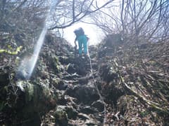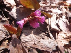 勢至菩薩を過ぎ、擬木の階段もある急坂を登る。登山道の両脇はイワカガミの光沢のある葉で覆われ、ポツリポツリと花が咲き始めていた。もう少し日にちが経つと見事な群落が見られそうだ。