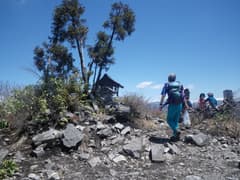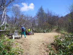 急登をこなして稜線上に登り着くと小広い草原があり、ベンチ、阿閦(あしゅく)如来と大日如来の石碑、「胴結場」と書いた道標がある。ベンチに腰を下ろして一休み。今日はすごく暑い。長袖シャツを脱いでTシャツ1枚になり、ポリタンの水を飲む。ここから高社山を良く眺めることができ、山腹に突き出る黒々とした岩峰(大黒岩)が目を引く。