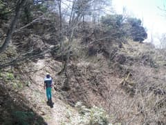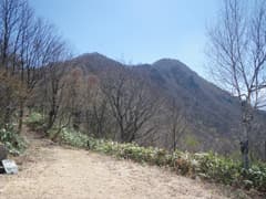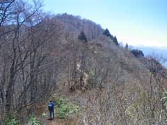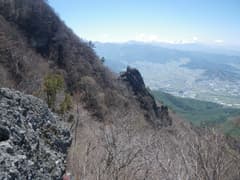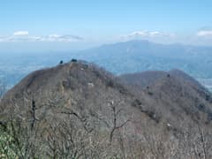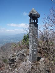 稜線を登ると、十三仏最後の虚空蔵菩薩がある。稜線を辿る間、左(北)側山麓からパーン、パーンという乾いた音が続けざまに聞こえ、ちょっと気になる。木の間を透かして山麓を見おろすと、雪がすっかり消えたスキー場が広がる。音の元はどうもその近くの射撃場らしい(後日検索すると確かにあった)。