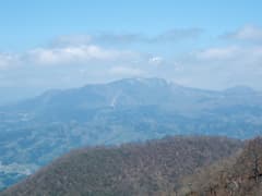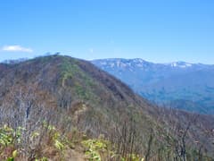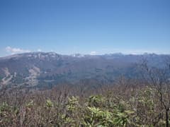 まず東から南にかけては志賀高原の竜王山、東館山(この辺はゲレンデスキーで滑ったことがある)、赤石山、左に緩い稜線を引く横手山、兜のような山容が目立つ笠ヶ岳が見え、さらに上信国境稜線の御飯岳、四阿山までずいいーっと眺められる。これらの山々はもう残雪が少ない。南には生き生きとした緑が眩しい善光寺平が一望できる。