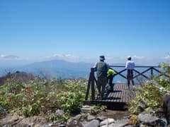 西側の眺めは、展望デッキから良く眺められる。御嶽(西峰)の向こうに斑尾山がなだらかな稜線を広げ、その奥には雲間から妙高山や火打山が白い頂を覗かせている。左に目を転じると黒姫山や高妻山が続き、遠くには白馬岳まで眺められる。残雪の北アを目にして、Mさんはかなり行きたそうな様子。