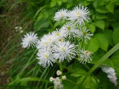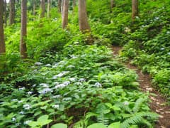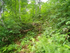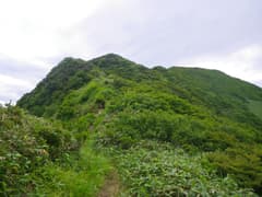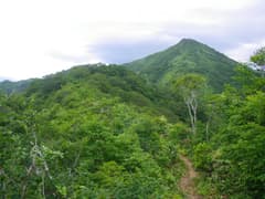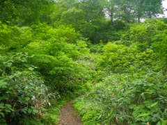 入口は夏草に覆われているが、杉林の中の登山道はしっかり踏まれていて藪はない。日陰に群れて咲いているエゾアジサイやトリアシショウマを眺めながら、高度を上げる。やがてブナ林に入り、小尾根上を登る。展望はほとんどなく、単調な登りにしばし没入する。