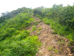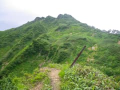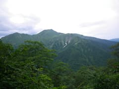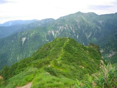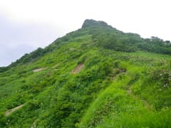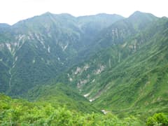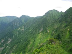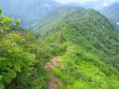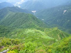 大ベタテ沢の頭からは、少し下ったのちに急登に差し掛かる。左側は万太郎谷に切れ落ちる草付きの急斜面で、枝沢の底には雪渓が白く光る。右側は毛渡沢の支流の源頭が食い込んで来ている。両側を急斜面に挟まれた痩せ尾根を急登する。尾根道はザレて滑り易いが、危険個所にはトラロープが張られている。