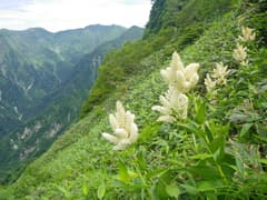 井戸小屋沢の頭から、さらに急登が続く。途中、ロープのないザレた斜面があり、距離は短いが歩きにくい。草付きの斜面にはいろいろな花が咲いていて、立ち休みがてら写真を撮りつつ登る。