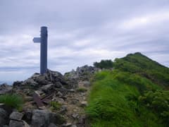 やがて岩峰群の頂上に近づき、右側から回り込んで岩場を急登する。この辺りで、下って来たハイカーさん数パーティと交差する。岩峰群の一角に登り着くと、その先にも小さな岩峰がポコポコと連なり、一番奥の台形状のピークには道標らしい柱が立っているのが見える。ここに至って、あの道標の立つピークが主稜線で、井戸小屋沢の頭は疾うに過ぎていることに気がつく。いやー、道理でなかなか着かなくて、くたびれるはずである。万太郎山の頂上はあと少しだから、そこまで頑張ってしまおう。