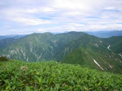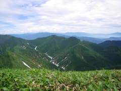 大展望を肴に、まずは缶ビール。うまーい。それからラ王を作って昼食とする。食べ終わってまったりしていると、単独の男性ハイカーさんが登って来た。話を伺うと、谷川岳から縦走して来て、この万太郎山で群馬百名山が完登になるとのこと。また、前日には日帰りで丹後山〜中ノ岳を周回されたらしい。2日連続でハードな行程をこなすとはすごい人だなあ、とびっくりする(後日、ハイトスさんの掲示板で「なかさん」という方であると知る。やはり、その筋の方でした^^;)。