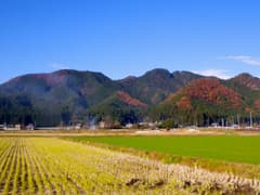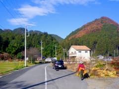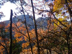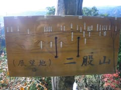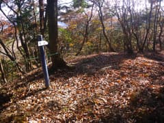 ここから雑木林に覆われた枝尾根の急な下りとなる。終盤の紅葉を透かして、二股山の頂上を振り返る。手軽に登れて変化に富み、大展望も楽しめるなかなか良い山だった。往路との分岐点に降り着くと「おつかれさまでした」の標識に迎えられる。最後まで配慮が行き届いたコースで、整備された方に感謝しつつ、駐車地点に戻った。