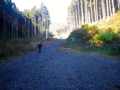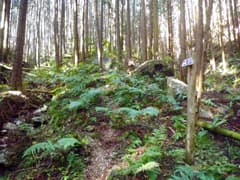 往路は山道となり、旧堰堤を越えると鬱蒼とした杉林に入る。シダが生い茂り、しっとりした雰囲気である。明瞭な登山道が続き、要所には道標があって迷うことなく歩ける。最初は緩いが徐々に傾斜が増して、V字に切れ込んだ沢に沿って登る。里から少ししか入り込んでいない割には深山の趣がある。