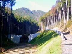 二股山を見上げながら沢の左岸の作業道を進むと、真新しく巨大なスリット型砂防堰堤がある(今年6月に完成とのこと)。