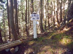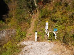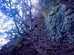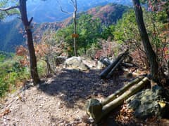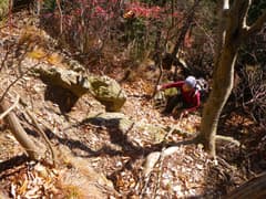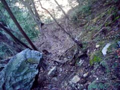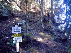 やがて急斜面に差し掛かるが、登山道は丁寧に小さくジグザグを切って付けられているので、楽に登ることができる。小尾根を絡んで急登すると、加園(かぞの)からの登山道と合流する。