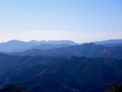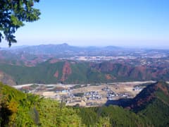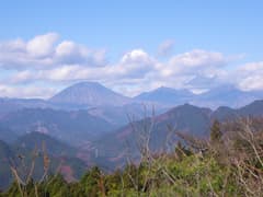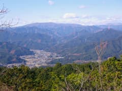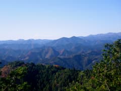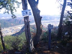 合流点から右へ、杉林に覆われた急な尾根を登ると展望地に着く。西から南にかけて眺めが開け、安蘇山地の山並みが一望できる。顕著なピークが少ないので山名の同定が難しいが、山並みの説明板が掲げられていて大いに助けになる。私がまだ登っていない山では、谷倉山の山容が大きくて目立つ。それと、奇麗な三角形の双耳峰のハナント山も気になるな。南にはうっすらと筑波山の山影も見える。丸太を並べたベンチに腰を下ろし、Kさん差し入れのお菓子を頂いて、しばし休憩する。