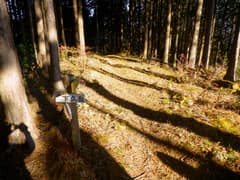 満腹してまったりした後、下山にかかり、下沢回遊コースの復路を降りる。登山口からも見えたTV中継所の白い建物の横を通り、杉が奇麗に植林された尾根を下る。中継所への送電のために電柱が立ち並ぶのは里山らしいが、登山道は明瞭で歩き易い。途中の急坂には迂回路があるし、直通路もトラロープが張られたり、丁寧にジグザグが切られていて、とにかく良く整備されている。
