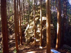 丸太ベンチのある「つつじ平ら」を過ぎ、なおも杉林の尾根を下る。鞍部から左に下沢林道への道を分け、尾根を直進。小さなアップダウンがあり、「322m」の標識のあるピークを越えると杉林の中に不動岩なる大岩(高さ5m)が立つ。最後の登りにかかり、下沢城跡の堀切や土橋、石垣を見ると標高368mのピーク(背戸山の山名標あり)に着く。木立に囲まれて展望に乏しいが、木の間から大芦川沿いの集落がすぐ下に眺められる。
