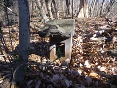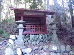 ようやく傾斜が緩んで、なだらかな肩のような場所に登り着くと、厚く積もった落ち葉に半分埋もれた石祠がある。掘り出すと、「天保四癸巳(1833)年七月吉日」の銘があった。