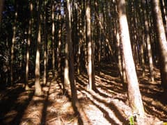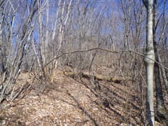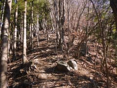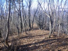 おかぼ平から広い尾根を僅か下って、緩く登り返す。杉の植林帯に入ると、日陰から吹き上がる風が冷たい。杉林から再び雑木林となり、尾根を登る。所々の立ち木に赤テープがあり、こんな所を登る人もあるようだ。