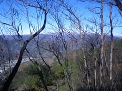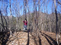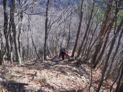 下山は、789m標高点の南西側の谷を茂木の集落へ下るルート(登山道なし)をとる。大畑山に向かって縦走路をしばらく辿り、小鞍部から下り易そうな斜面を選んで、谷へ下降する。落ち葉の積もった急斜面にくっきりと獣道がついており、これを利用させて貰って谷底に着く。