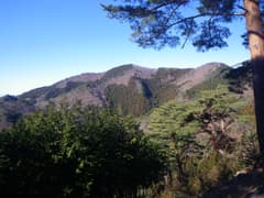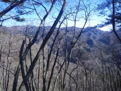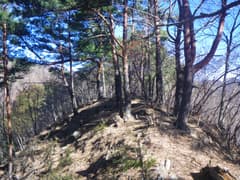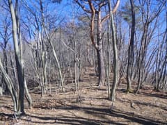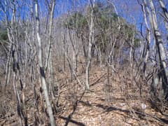 尾根は斜度を増して、ところどころに露岩が現れる。疎らな木立を透かして、鳴神山から丸山へ続く山稜が眺められる。最初の尾根の取り付き程ではないが結構な急坂となり、一直線に尾根を登って行く。