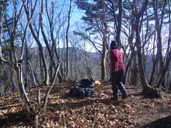 やがて傾斜が緩むと、そこはもう789m標高点の肩にあたる個所である。ほとんど平らな尾根を辿り、789m標高点のピークに到着する。ここで昼食とし、パンやコーヒーを頂く。直ぐ先に荒神山稜の縦走路が通る。この縦走路は以前歩いたことがあり、そのときもここで昼食としている(山行記録)。まだ緑のある季節の曇りの日だったから、冬枯れで晴天の今日は別な場所のような印象をもつ。