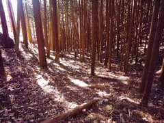 広く緩い谷は杉の植林に覆われ、流水はない。枝打ちされた枝葉がふかふかに積もるが、歩き難いという程ではない。この谷をずっと下る。両岸は急斜面で岩壁が結構多い。結果的にうまいルートで谷に降りて来られたようだ。