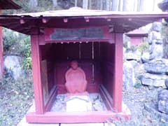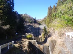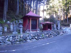 谷に沿って下るとボロボロの廃屋が現れ、そのすぐ先で車道に出る。車道を突っ切って谷を下ると再び車道が現れ、砂防堰堤を右岸から巻いて堰堤下に出る。さらに車道を下ると茂木バス停(みどり市「電話でバス」)があり、その横に3つの朱に塗られたお堂と多数の石仏がある。