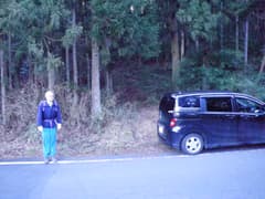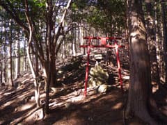 意外な大展望を楽しんだのち、杉の植林の中を下ると穴切峠に着く。常緑の木立の下に赤鳥居と石祠が祀られている。