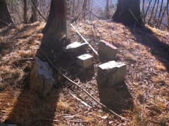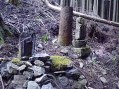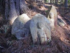 途中に三体の石仏があるとのことで、以前来て見たことがあるMさんの案内で枝尾根上の作業道を下ると、ありました石仏三体。やまの町桐生の「穴切峠〜高戸山」や偏平足さんの「石仏372高戸山(群馬)」の記事によると、地蔵菩薩二体と如意輪観音で、女性の墓塔ではないかとのこと。