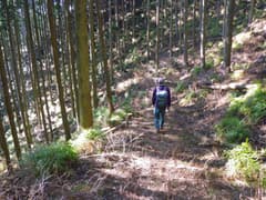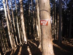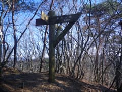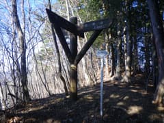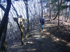 杉の植林に入り、急坂を登って赤雪山〜仙人ヶ岳の縦走路に出る。縦走路を右に辿り、急坂をもう一段登ると、「←仙人ヶ岳1.3km 赤雪山2.9km→」の立派な道標が立つ。三角山の頂上はこの道標のすぐ奥である。密な杉林に囲まれて狭苦しいので、休憩は次の神楽場にしよう。