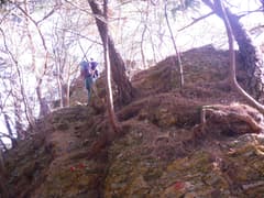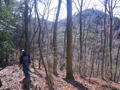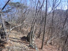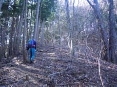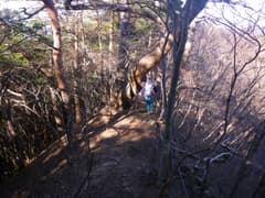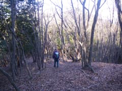 ここから三角山に向かって、冬枯れの明るい雑木林の尾根を歩く。意外とアップダウンが多く、変化に富む。松の幼樹の生えたピークから名の通りの山容の三角山を望む。大きく下ったのち、痩せ尾根を辿って登り返す。