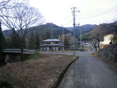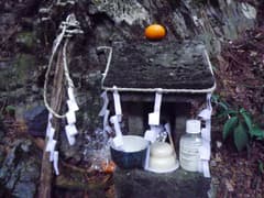 穴切川にかかる小滝を眺めながら林道を辿る。鏡餅やミカン、酒など正月のもの一式がお供えされた石祠の前を通り、程なく車を置いた穴切の集落に帰り着いた。
