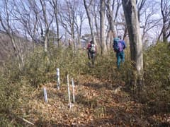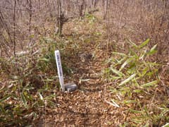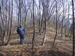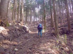しばらく林道を辿り、適当なところで右の山腹に取り付いて、杉林の中の作業道を上がる。林内で錯綜する作業道を辿り、やがて作業道を外れ、枝打ちされた杉の枝葉を踏んで上方の尾根を目指す。大した登りもなく尾根上に着いたが、身体は良く温まってきて上着を脱ぐ。