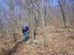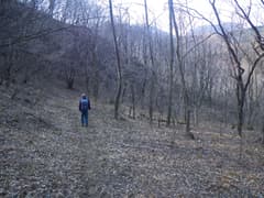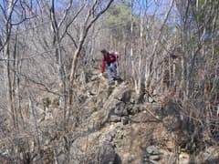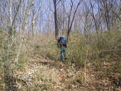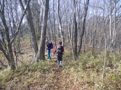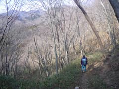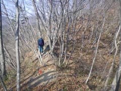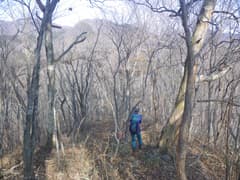 ここから尾根上を登る。結構な急登だ。杉林を抜けると明るい雑木林の尾根となる。微かな踏み跡らしきもの(けもの道?)も現れ、落ち葉を踏んで登って行く。