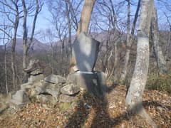 標高が上がると、左肩に覗岩がにょっきり突き出た旗矢岳(幡矢ヶ岳)や鐘原ヶ岳などの榛名山南面の山々が、冬枯れの雑木林の間に見えて来る。尾根が平坦になると鐘撞山の頂上の一角で、三角点標石と山名標がある。