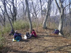 頂上は疎らな林に囲まれて狭いが、それが幸いして風当たりが弱い。雰囲気も明るいし、数人が腰をおろして休むスペースもあるので、ここで昼食とする。Kさん差し入れの食料を頂いていたら、持参のうどんを食べるまでもなくお腹がいっぱいに。一時間程のんびり過ごす。