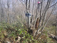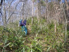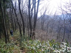 ここから小さな登り降りのある尾根をしばらく辿る。最後は音羽山への急坂となり、ササに覆われた尾根を一気に上がると、平坦な頂上稜線の左肩に登り着く。平坦な稜線を右(東)に辿ると、三角点のある音羽山の頂上に着く。