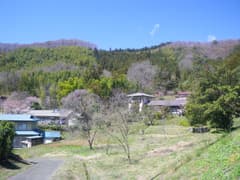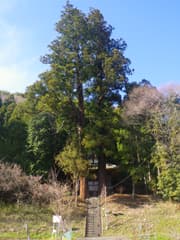 鍾乳洞公園の入口まで戻ると、県道右側に嵯峨宮の鳥居がある。説明板に依ると、弘仁四(823)年に最澄の願が嵯峨天皇によって許されて設立されたとのこと。立ち寄ってみますかな。畑地の奥の山裾に二本の杉の大木と小さな社殿がある。振り返ると、里山に囲まれた小平の集落を見渡すことが出来る。
