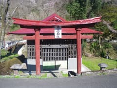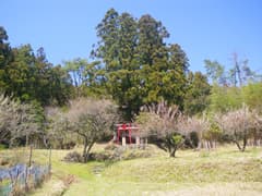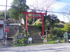 採石場入口から左へ車道を登る。数軒の民家を過ぎると、山の端の斜面の奥に赤い鳥居と高い杉木立が見える。立ち寄ってみると、小さな石垣の上に稲荷神社が祀られている。この神社から稜線へ通じる山道があるかもと期待したが、そんなものはなく、密な竹藪で入り込めそうにない。
