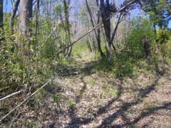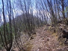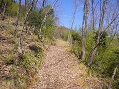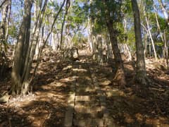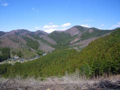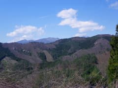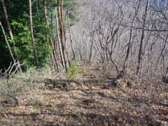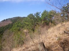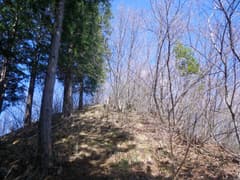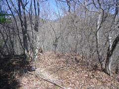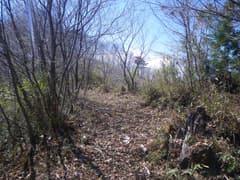 山の端を左へ向かう小道をしばらく辿って、取り付けそうな所を探す。竹藪の切り開きがあり、これを登ると細い作業道に出た。この作業道は分岐が多く、枝道が錯綜しているが、上に向かう道を適当に辿って行くと、幸運にも稜線上まで登り着いた。稜線の北面は伐採されていて、展望が得られる。