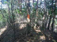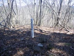三角点標石に戻って、稜線を北東に進む。作業道から離れ、杉林と雑木林の境界の稜線を登ると、短い急登があって小ピークの頂上に着く。出発が遅くて、もう13時を回っているので、ここで昼食。パンとペットボトルのお茶で手軽に済ませる。
