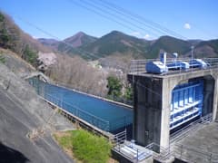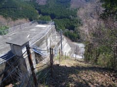 三角点標石の先の平坦な稜線を進むと、左斜面のすぐ下に導水路が見える。導水路の先は、麓に向かって真っ逆さまに落ちる水圧鉄管に続いている。これは、草木ダムから小平発電所へ送水する設備だ。静かに深く渦巻く流れを見ていると、引き込まれそうでクラクラする。導水路付近は急な法面なので、近寄らないのが吉である。
