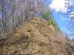 稜線を辿ると、右側に採石場を見おろすようになり、稜線直下まで階段状に削られた斜面となる。土曜日でも採石場は操業しているようで、作業の音が風に乗って聞こえて来る。やがて、稜線まで削り取られた区間となり、急なエッジを雑木の小枝を摑んで半ば強引に登って行く。多少スリルがあるが、足元がボロボロな上に藪っぽいので、好事家向き。